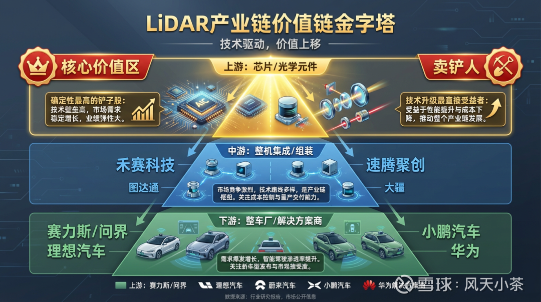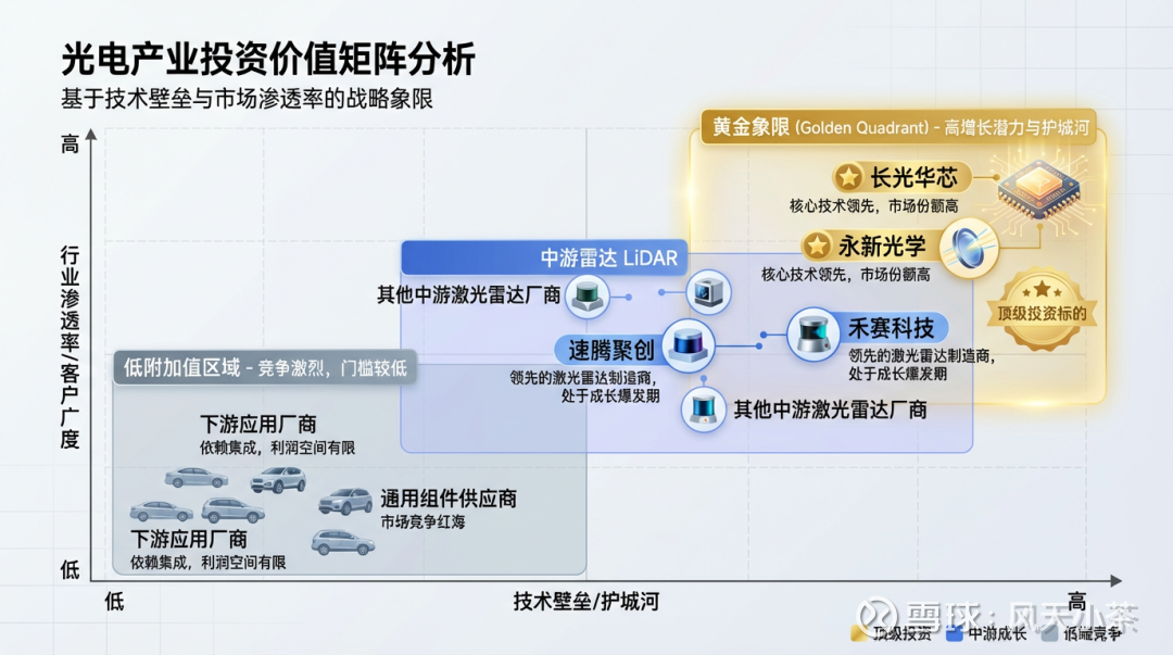 对投资者的启示:在科技产业颠覆期,应优先关注产业链中具备高技术壁垒、高客户粘性、且处于价值关键环节的“卖铲型”公司。它们往往能提供更确定的成长性和抗风险能力。当前,激光雷达产业链的投资焦点应“重上游、选中游、观下游”,在上游寻找技术迭代的“压舱石”。