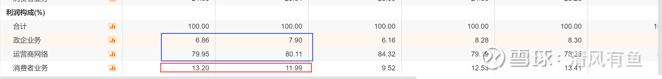 这么拆分出来就是,在最赚钱的业务运营商网络业务只降了5.99pct的时候,虽然政企业务增幅高达109.93pct,消费者业务也有增幅的情况下,利润同比下滑了。