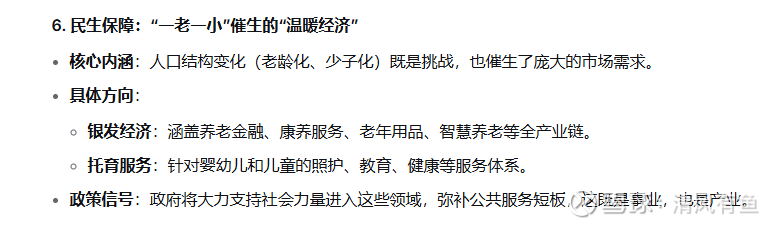 国庆期间钟才文发布了八篇文章!我呢,其实听别人解读过!然后呢?我还是利用好工具进行一次提炼!我把焦点落在了!“在经济增长模式转换的“换挡期”,市场和公众最关心的是“未来机会在哪里”。系列文章清晰地勾勒出六大机遇领域(产业升级、科技创新、新消费等)和新质生产力的方向,实质上是向社会和资本发布了一份“未来投资指南”,引导资源向国家战略需要的领域聚集。”