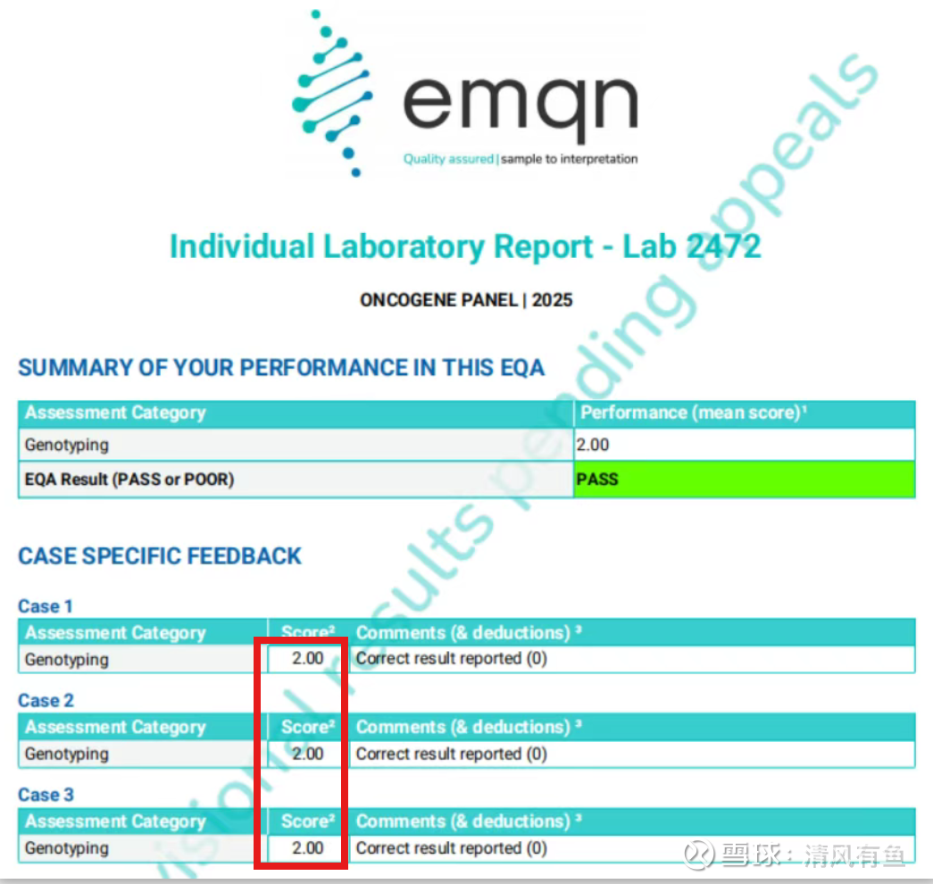 1. 技术与质量管理的国际权威背书:EMQN 是全球分子遗传学临床实验室的顶级认证机构,其质评结果直接反映实验室技术准确性、质量管理规范性和服务专业性。连续两年满分通过,印证了迪安诊断在实体瘤基因检测领域的技术实力(基因分型精准度达国际顶尖水平)和标准化管理能力,打破了 “本土研发技术是否达国际标准” 的行业疑虑。