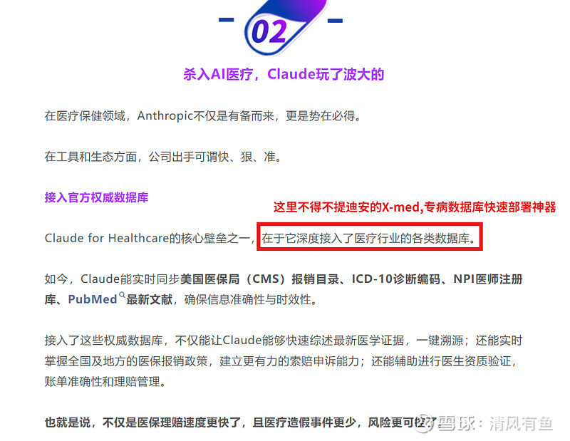 如果说ChatGPT Health瞄准的是普通用户,而Claude for Healthcare,则瞄准整个医疗系统、保险、患者、乃至上游药物研发等各个环节。 医疗AI平台和基础设施争夺战,正式拉响。