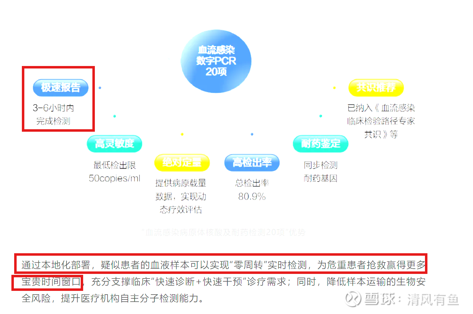 迪安诊断推出“数字PCR本地化快速检测”——血流感染病原体核酸及耐药检测20项”,聚焦13种临床常见BSI核心病原(含革兰阳性/阴性菌、真菌)及7种耐药基因(如mecA、blaKPC、OXA-48等),可以实现快速报告周期(样本到达实验室后3-6小时)和超灵敏绝对定量(最低检出限50copies/ml),显著提高临床检出率(总检出率80.9%),为血流感染患者提供更快捷、更准确的病原学诊断与动态监测方案。