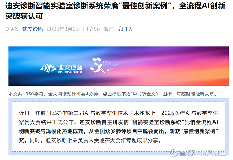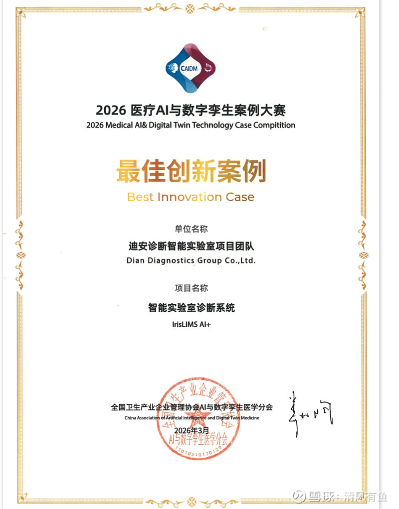 近日,在厦门举办的第二届AI与数字孪生技术学术沙龙上,2026医疗AI与数字孪生案例大赛结果正式公布。迪安诊断自主研发的“智能实验室诊断系统”凭借全流程AI创新突破与规模化落地成效,从全国众多参评项目中脱颖而出,斩获“最佳创新案例”奖。同时,迪安诊断相关负责人受邀在大会作专题成果分享。