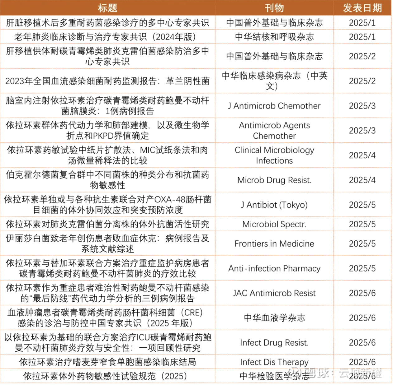 - 2025年6月,《中华检验医学杂志》正式发表《依拉环素体外药物敏感性试验规范(2025)》,为规范开展依拉环素体外药敏试验和结果解读提供参考,以期“有据可依”地指导临床合理用药; 同时也有助于促进临床微生物学实验室对依拉环素药敏试验作方法的规范性和结果报告的准确性,“有依可靠”地支持依拉环素应对临床多重耐药菌感染和复杂感染的挑战。该规范由国家卫生健康委临床抗微生物药物敏感性折点研究和标准制定专家委员会(ChinaCAST)、中国医院协会临床微生物实验室专业委员会、欧洲临床微生物与感染病学会药敏委员会华人药敏试验委员会共同制定。此次发布的规范与2024年ChinaCAST发布的依拉环素中国临床折点相辅相成,形成“尺规合一”的完整技术体系。