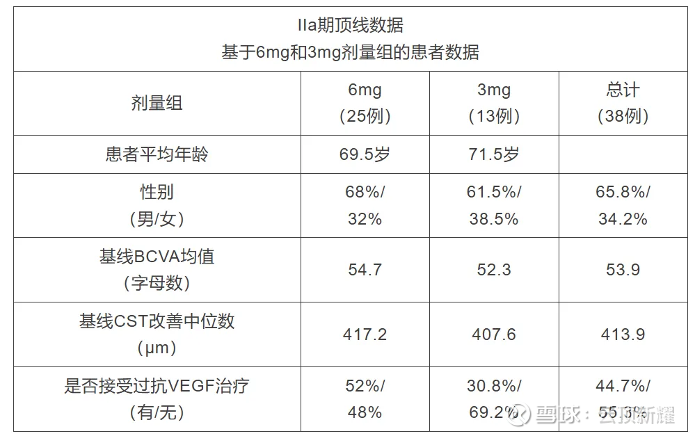 患者特征:该研究在中国共入组38例湿性AMD患者,涵盖既往未接受过治疗的患者,以及曾接受VEGF治疗的患者。患者按2:1的比例随机分配至6mg组(25例)和3mg组(13例)。