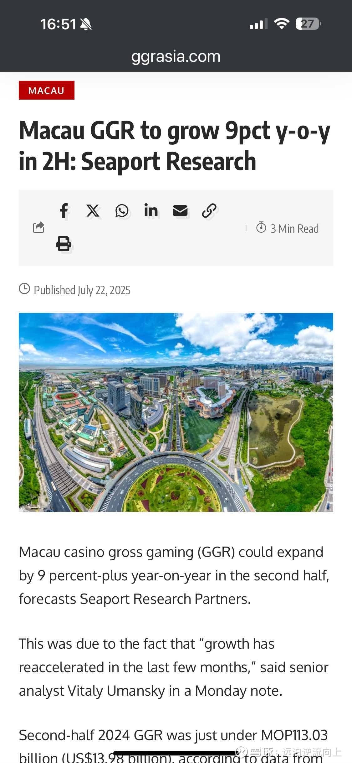 $新濠国际发展(00200)$今天还没发布赌收。ggrasia发布了一篇意料之中的报告。概括下就是1. 下半年赌收预计按年增9%,月平均200亿以上,2. 未来增长机会在阿拉伯市场,3.暑期增长正在开花结果,4.持续看好澳门市场长期增长。仅搬运。别做买卖参考。