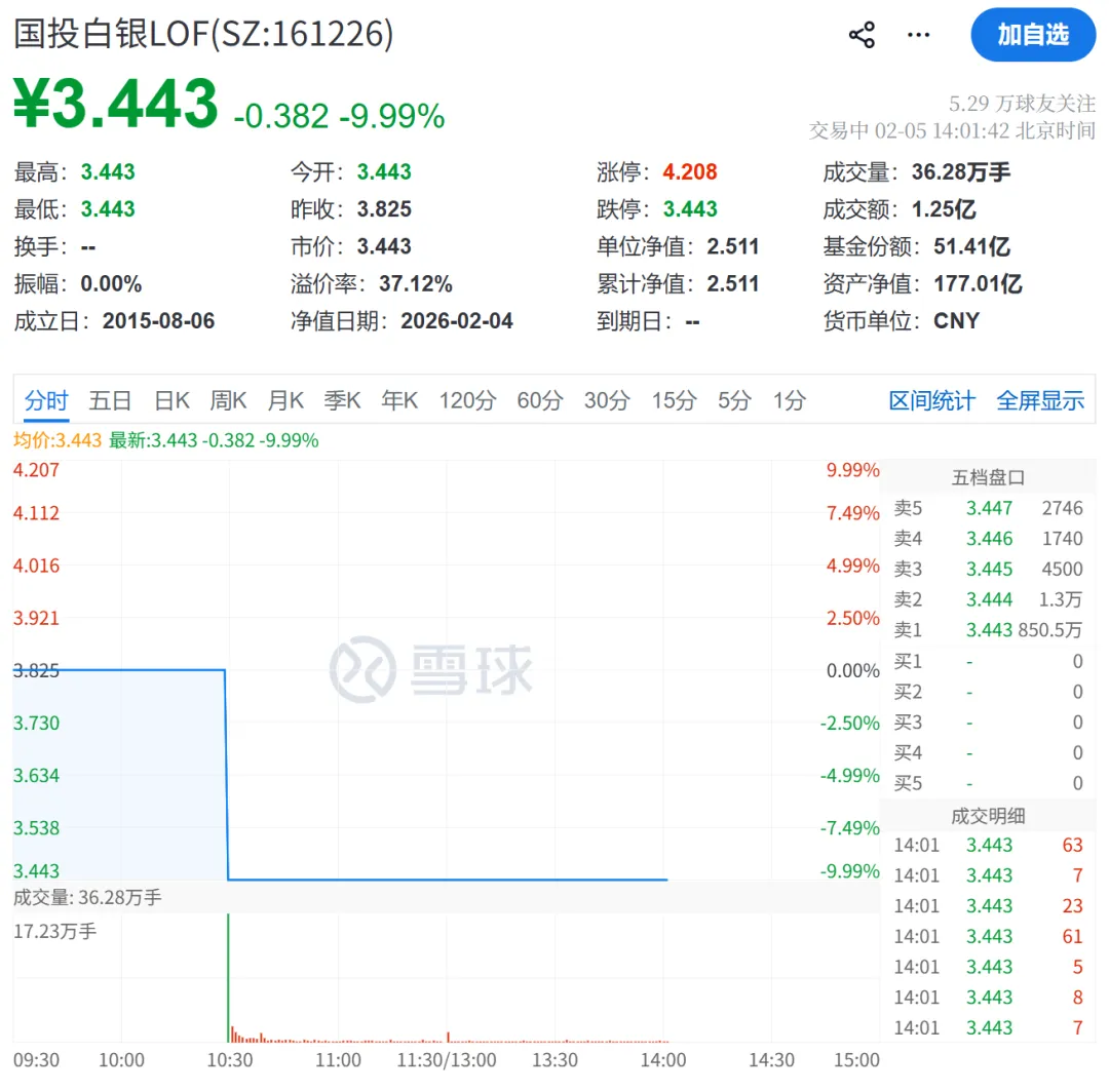 2月4日,国投白银LOF在10点30复牌后一字跌停,连续三连跌,溢价仍高达64.6%,场内有2.4亿元成交额,意味着依然有资金顶着高溢价买入。