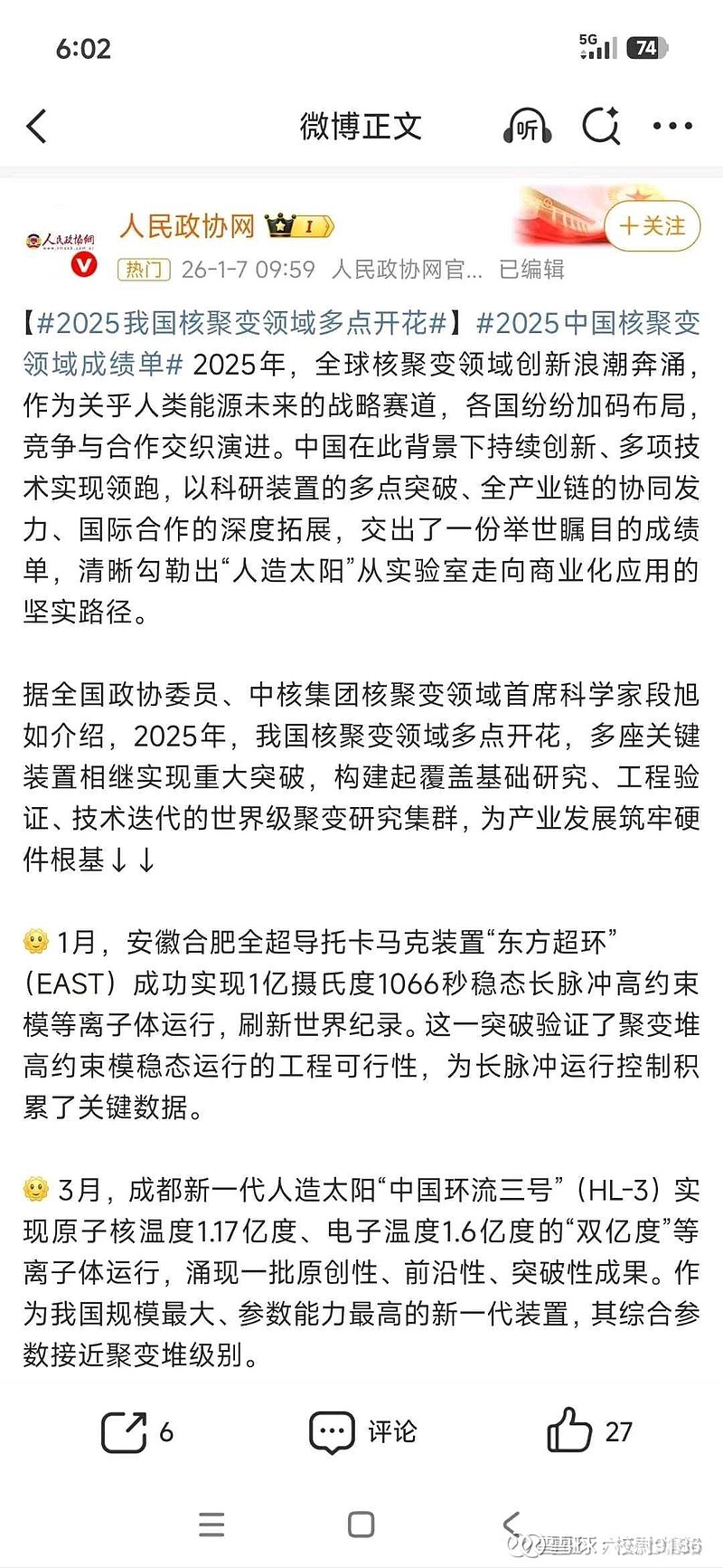 3月,成都新一代人造太阳"中国环流三号"(HL-3)实现原子核温度1.17亿度、电子温度1.6亿度的"双亿度"等离子体运行,涌现一批原创性、前沿性、突破性成果。作为我国规模最大、参数能力最高的新一代装置,其综合参数接近聚变堆级别。$中国核建(SH601611)$ $中核科技(SZ000777)$