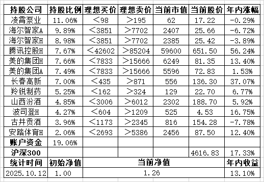 表格中“理想买价”、“理想卖价”都是波波主观认为该公司的估算市值。如果“当前市值”超过“理想卖价”的市值、或有明显更低估的投资标的、或公司经营状况改变,我会卖出。如果“当前市值”低于“理想买价”和“理想卖价”中位数以下才有可能买入。表中“理想买点”、“理想卖点”、“当前市值”的都是指公司市值;“理想买点”、“理想卖点”的单位都是“亿元人民币”;“当前市值”中, A 股的单位是“亿元人民币”,港股的单位是“亿元港币”。“年内涨幅”指当前最新价与去年年末前复权价格的涨跌幅。当前持仓比例总和可能和 100% 略有出入,原因是每个持仓比例四舍五入、持仓比例低于 1% 并只保留 1 手的标的未列示和统计。