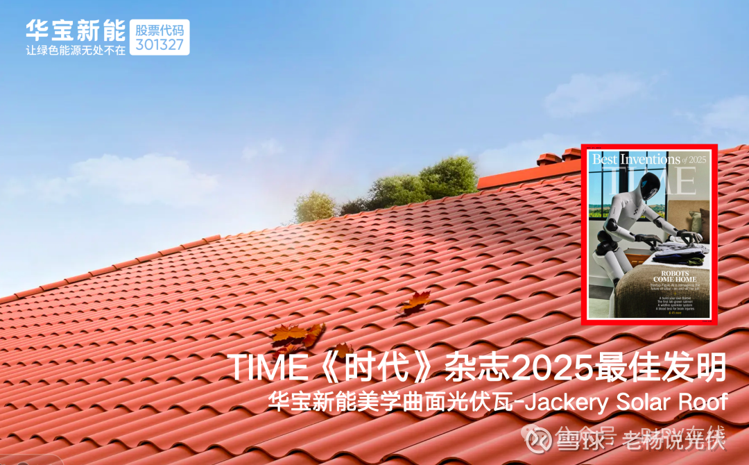10 月,美国《时代周刊》(Time)正式公布2025年 “Best Inventions of the Year”(年度最佳发明榜单),华宝新能自主研发的全球首款XBC晶硅多曲光伏瓦——美学曲面光伏瓦成功入选。该产品凭借对光伏建筑一体化(BIPV)的突破性创新,将绿色能源与建筑美学深度融合,成为可持续领域的创新发明之一。值得关注的是,这是华宝新能旗下产品第二次登上该榜单,继2023年Jackery电小二光充火星机器人5000入选后,华宝新能再度向全球展示其在绿色能源领域的卓越创新实力。