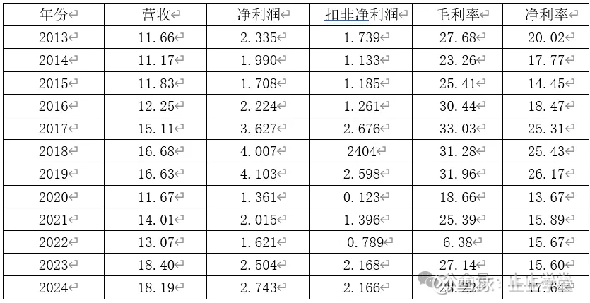 从上市后的第一个完整年报2013年到2024年,12年间,渤海轮渡营收整体成上升趋势。营收整体的上升趋势并没有换来净利润和扣非净利润的增长。增收不增利的反映在毛利率和净利率的下降。如下表所示: