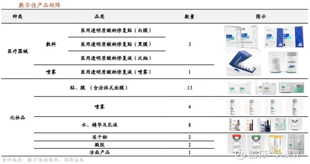 以敷尔佳为例,其产品矩阵包括医疗器械和化妆品两大类,医疗器械分类中有3款医用敷料产品,即医用透明质酸钠修复贴(白膜、黑膜)、医用透明质酸钠修复液(次抛),以及1款喷雾产品,医用透明质酸钠修复液。敷尔佳的白膜、黑膜均已获批国家二类医疗器械批文。