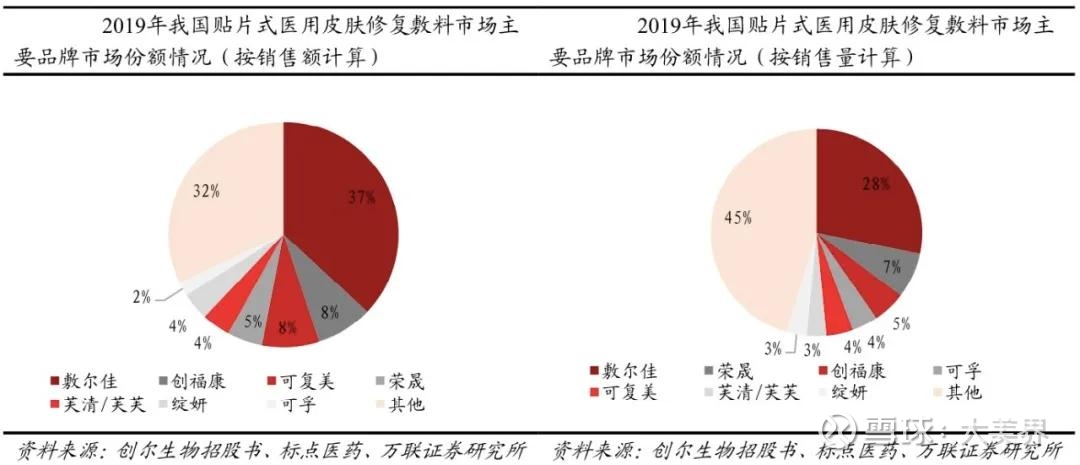 万联证券数据显示,中国贴片式医用皮肤修复敷料消费量从2017年的1.61亿片提升至2019年的3.37亿片,年复合增长率高达44.6%。且该市场集中度高,市占率(按销售额计算)排名前7的品牌占据了全市场接近70%的份额,包括敷尔佳、创福康、可复美、荣晟、芙清、绽妍、可孚。