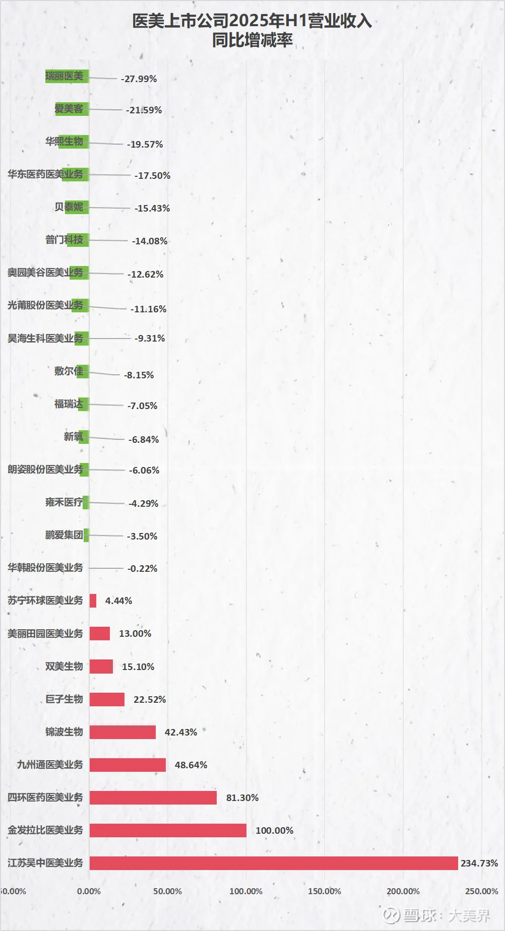 《大美界》统计数据后发现,龙头企业们过去超10%的医美业绩增速已经不再,同比增长率普遍为负,哪怕竞争壁垒更强的上游也遭遇同样境遇。