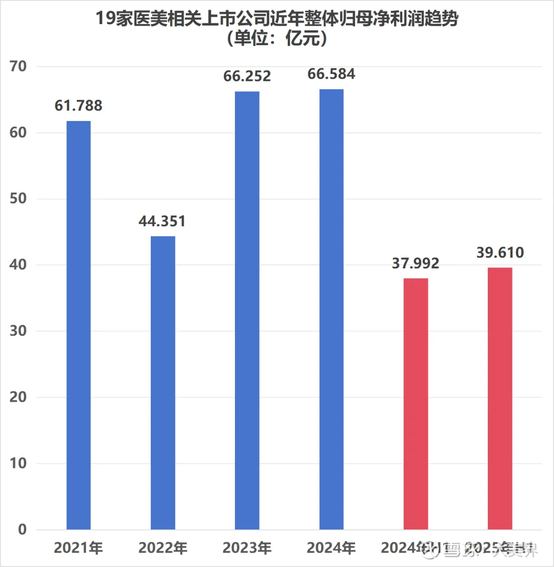 对此,《大美界》在剔除5家未公布医美业务盈利指标的企业后,对19家上市企业在2021年—2024年,以及2025年上半年的整体盈利进行拉通梳理后发现,医美上市公司的整体盈利能力正变得更为强劲:今年上半年盈利39.61亿元,已经达到2024年全年的约59.49%。