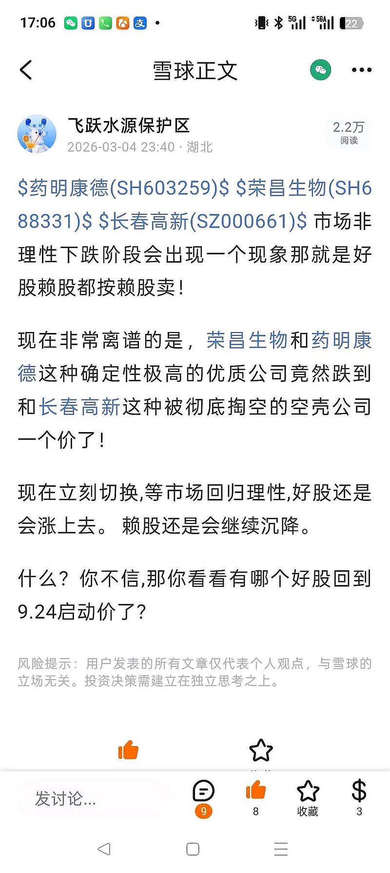 $长春高新(SZ000661)$ $荣昌生物(SH688331)$ 3月4日发帖那天,荣昌生物a股88元,长春高新89元,今天荣昌生物144元,长春高新88元!我的判断是:未来两年荣昌生物500左右的时候,长春高新仍然会在50-79一线徘徊!泥沙俱下的时候,好股赖股都受伤,那时候就会出现极端的不理智情况,就是好股赖股都跌到一个价!行情恢复理智之后,好股一路向上,赖股那就继续沉降!