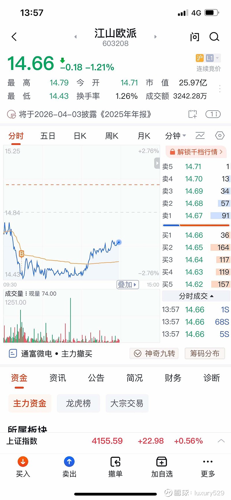 $江山欧派(SH603208)$ 今儿这走势就是缩量阴跌后小反弹,量能还是弱,做T的话:低吸就盯着14.4-14.45这个实锤低点区间,企稳就小仓接反弹到14.7-14.8没量就抛,1%左右差价落袋就行,别贪还是老规矩,机动仓20%-30%,底仓别动,尾盘尽量平T仓公司短期业绩预亏有点影响情绪,但定制家居赛道长期有空间,磨底阶段拿底仓做T降成本就好,别慌。
