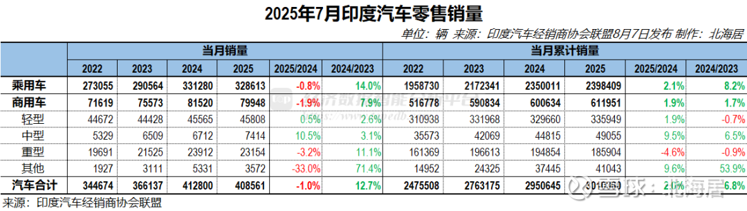 2025年7月,印度汽车零售销量完成40.86万辆,同比下降1.0%,上年同期增长12.7%。分车型看,乘用车零售销量32.86万辆,同比下降0.8%,上年同期增长14.0%;商用车零售销7.99万辆,同比下降1.9%,上年同期增长7.9%。