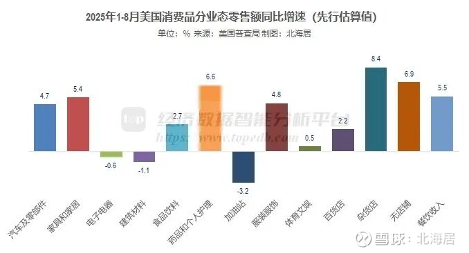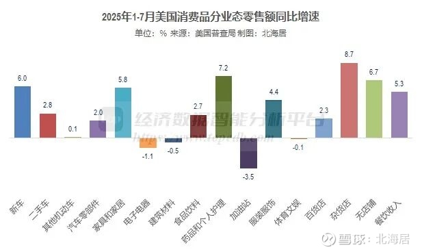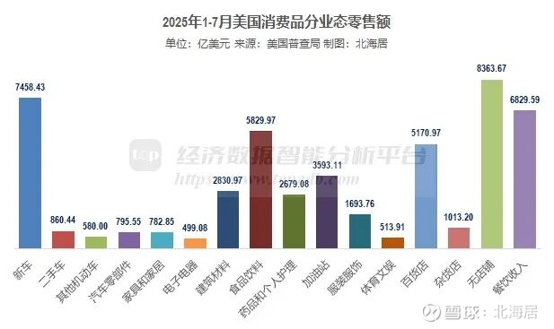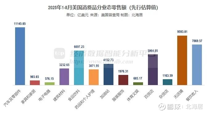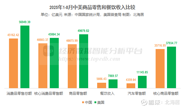 2025年1-8月,美国消费品零售总额为56949.39亿美元,同比增长3.8%,其中核心消费品零售额45804.34亿美元,同比增长3.6%,汽车零售额11145.05亿美元,同比增长4.7%。分消费形态看,商品零售额49079.82亿美元,同比增长3.5%;餐饮收入7869.57亿美元,同比增长5.5%;核心商品零售额37934.77亿美元,同比增长3.2%。