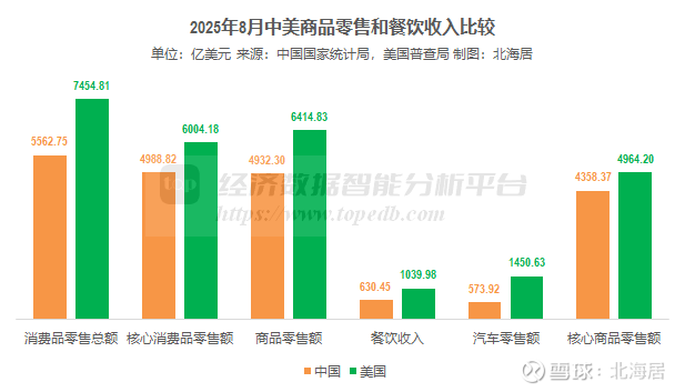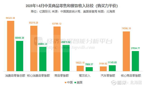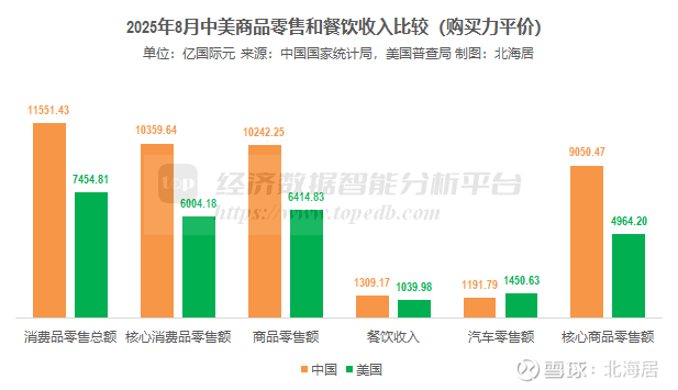 2025年8月,中国消费品零售总额相当于美国的74.62%,同比降低了0.04个百分点。其中,中国核心消费品零售额相当于美国的83.09%,同比提高了0.10个百分点;中国商品零售额相当于美国的76.89%,同比提高了0.43个百分点;中国餐饮收入相当于美国的60.62%,同比降低了2.47个百分点;中国汽车零售额相当于美国的39.56%,同比降低了0.82个百分点;中国核心商品零售额相当于美国的87.80%,同比提高了0.79个百分点。