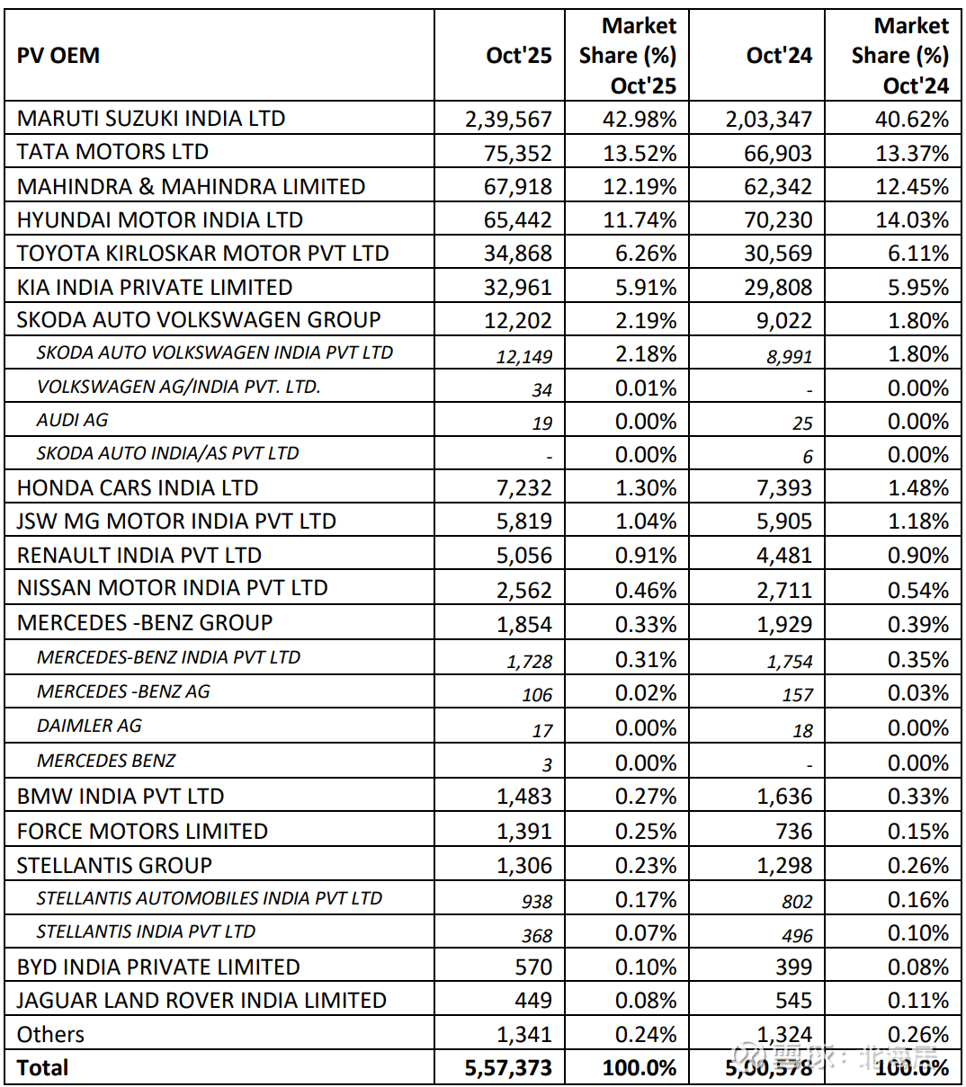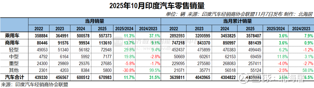 2025年10月,印度汽车零售销量完成67.10万辆,同比增长11.7%,上年同期增长31.5%。分车型看,乘用车零售销量55.74万辆,同比增长11.3%,上年同期增长37.1%;商用车零售销11.36万辆,同比增长13.7%,上年同期增长9.1%。