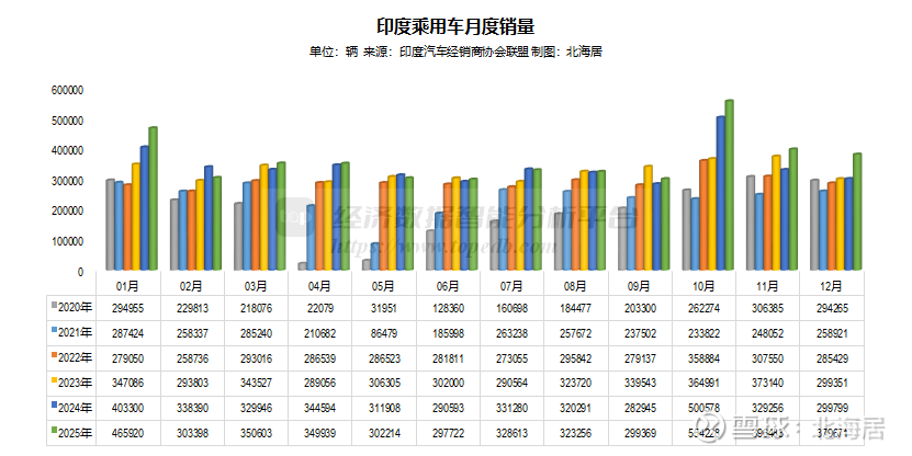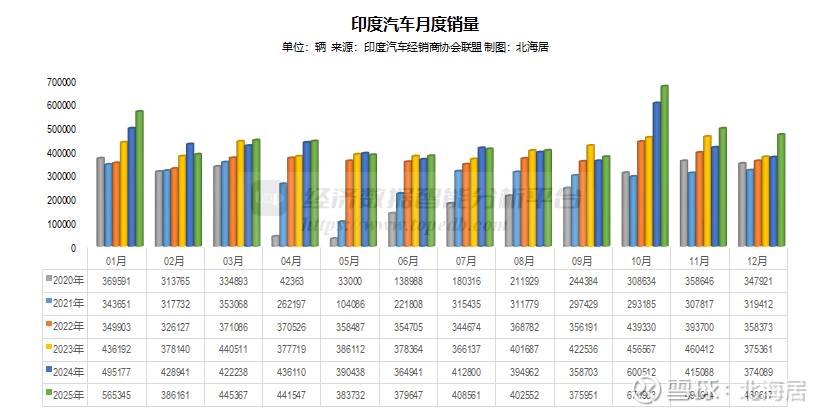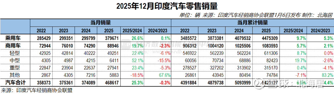 印度汽车经销商协会联盟1月6日发布了2025年12月份汽车零售销售数据。数据显示,2025年12月,印度汽车零售销量46.86万辆,同比增长25.3%;全年汽车零售销量542.31万辆,同比增长6.5%,较上年加快2.1个百分点。