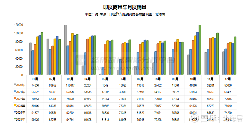 2025年12月,印度汽车零售销量完成46.86万辆,同比增长25.3%,上年同期下降0.3%。分车型看,乘用车零售销量37.97万辆,同比增长26.6%,上年同期增长0.1%;商用车零售销8.89万辆,同比增长19.7%,上年同期下降2.3%。
