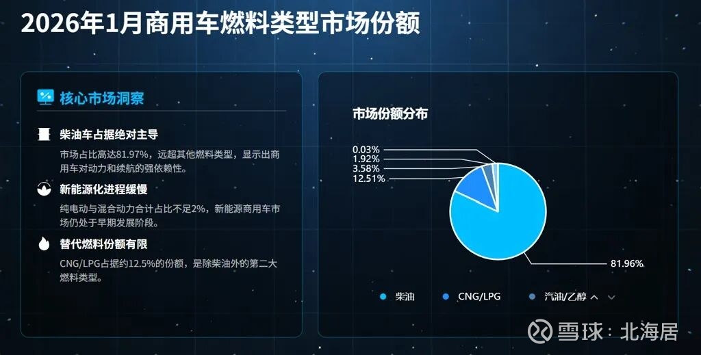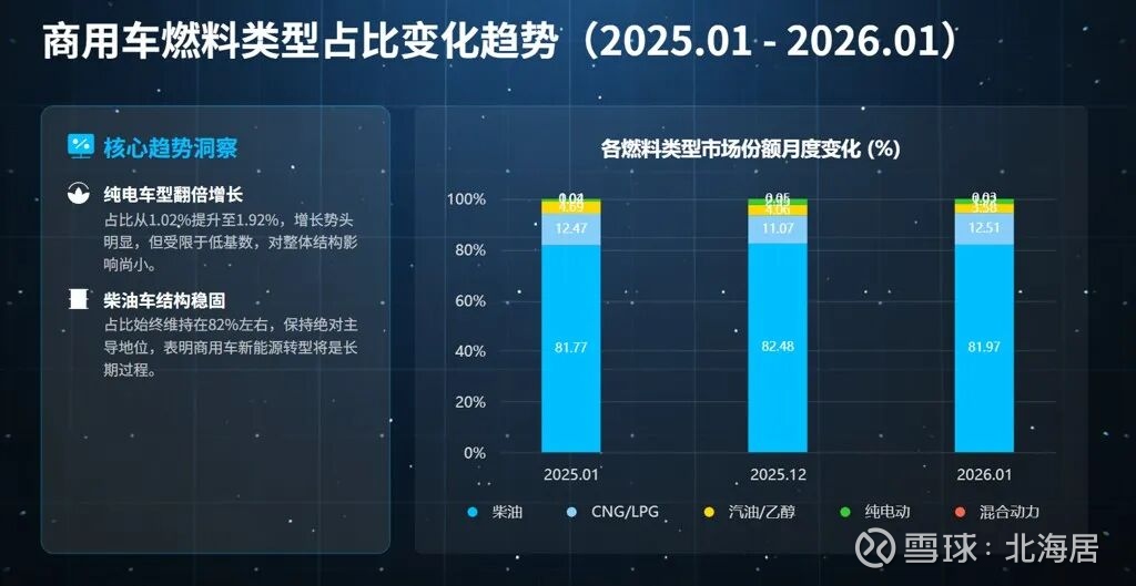 2026年1月,按燃料类型分,印度商用车汽油/乙醇车占比3.58%,柴油车占比81.97%,天然气车(CNG/LPG)占比12.51%,混合动力车占比0.03%,纯电动车占比1.92%。