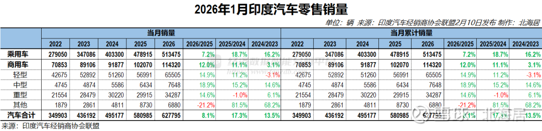 2026年1月,分车型看,印度乘用车零售销量51.35万辆,同比增长7.2%,上年同月零售销量修订为47.89万辆,同比增长18.7%;商用车零售销量11.43万辆,同比增长12.0%,上年同月零售销量修订为10.21万辆,同比增长11.1%。