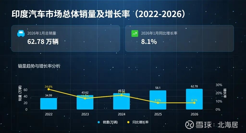 2026年1月,印度汽车零售销量完成62.78万辆,同比增长8.1%,上年同月零售销量修订为58.10万辆,同比增长17.3%。