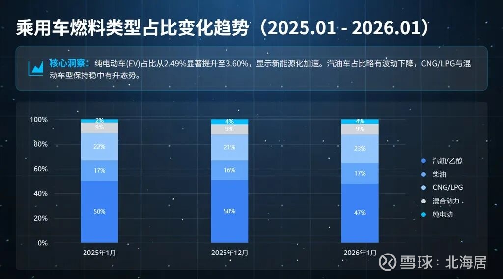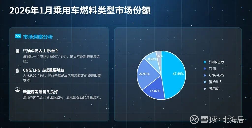 2026年1月,按燃料类型分,印度乘用车汽油/乙醇车占比47.49%,柴油车占比17.07%,天然气车(CNG/LPG)占比22.91%,混合动力车占比8.94%,纯电动车占比3.60%。