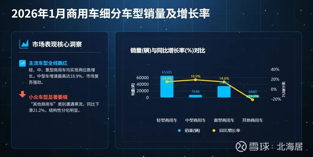 2026年1月,商用车细分车型看,印度轻型商用车销售65505辆,同比增长14.9%,上年同月零售销量修订为56991辆,同比增长11.2%;中型商用车销售7648辆,同比增长18.9%,上年同月零售销量修订为6434辆,同比增长15.2%;重型商用车销售34287辆,同比增长14.6%,上年月零售销量修订为29915辆,同比下降1.0%;其他商用车销售6880辆,同比下降21.2%,上年同月零售销量修订为8730辆,同比增长81.5%。