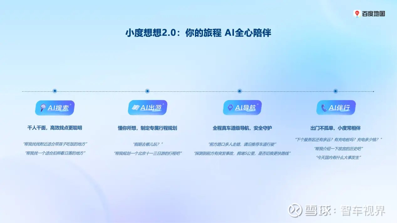 百度地图依托大模型能力深度融合并重构地图导航与座舱语音交互,跨越技术鸿沟,正式发布面向汽车行业全面开放的出行智能体——小度想想2.0,引领未来出行范式创新,打造智能化出行交互新体验。