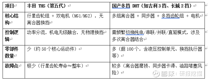 相比之下,国产多挡DHT(如吉利3挡、长城2挡)采用复杂但灵活的机械-电驱混合架构,依赖多组离合器、同步器、液压控制单元及多挡齿轮组来切换纯电、串联、并联和发动机直驱等多种模式。这种设计虽能实现更强的纯电驱动能力和高速直驱效率,但零部件数量超过100个,控制逻辑需频繁结合/分离离合器,带来离合器磨损、同步器卡滞、油路堵塞等潜在风险。本质上,丰田追求“用最少的零件做最稳的事”,而国产DHT则选择“用更多部件换取性能与功能的扩展性”。接下来,我们看下故障和维修的问题比较。