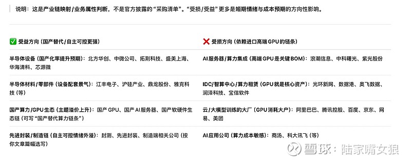 大家要清楚的是,关税的核心影响不是“AI需求消失”,而是“高端GPU跨境流动被加价/不确定性上升”——资金更容易向“设备材料国产替代”集中,而“进口GPU依赖链条”短期承压。