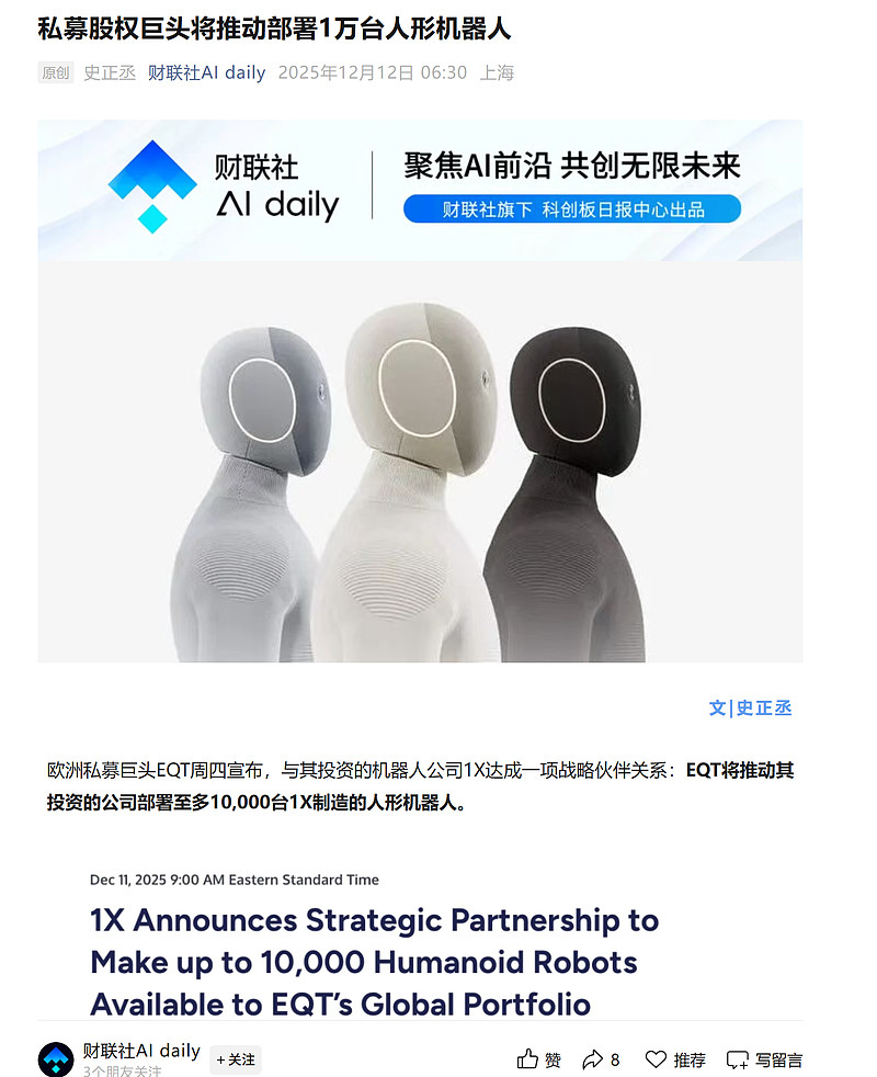 的利好又来了:全球私募巨头EQT与1X达成合作,将在2026—2030年促成最多1万台人形机器人部署,覆盖物流、仓储、制造、医疗等应用场景。