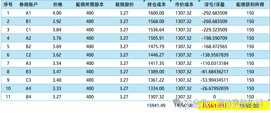 到了后面您会发现,在股价自从4元下跌到3.27元的时候,整个下跌幅度已经贴近22%,假设股价即便在确权的第二天最终以3.27元的价格左右浮动,只要转债按照115元的价格上市(较大概率),配债所得的1650元能抵消账户A1 - B4 的持仓成本,而且富有盈余。