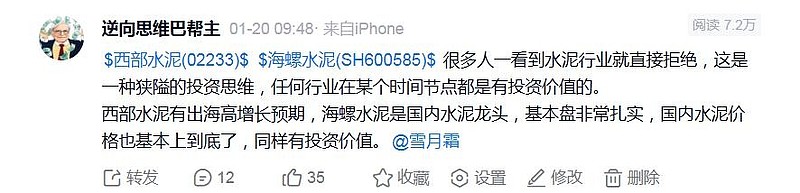 $西部水泥(02233)$ $海螺水泥(SH600585)$ 很多人做投资戴着有色眼镜,一看到水泥行业就直接拒绝,这是一种狭隘的投资思维,任何行业在某个时间节点都是有投资价值的。