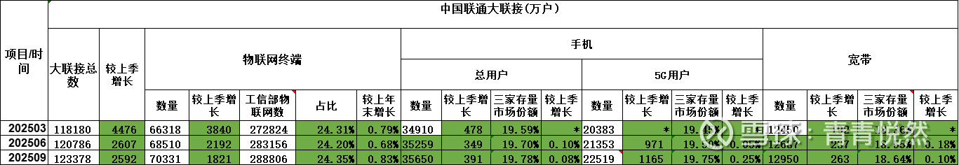 分析:截至2025年9月30日,中国联通物联网的三大运营商市场份额为24.35%,较2024年末增长0.83%,较2023年末增长3.16%,较2022年末增长3.43%;数据表明联通的物联网业务并非短期爆发,而是延续了近年来“持续增长”的强劲势头,成为公司业务版图中最亮眼的增长极之一。手机及其中5G用户、宽带市场份额受披露、统计口径等原因影响,上表只反映今年数据;但整体来看,中国联通的总市场份额已成功扭转了早前的颓势,自2023年起明确步入上行通道,并在此后几年内成功维系了这一积极态势。