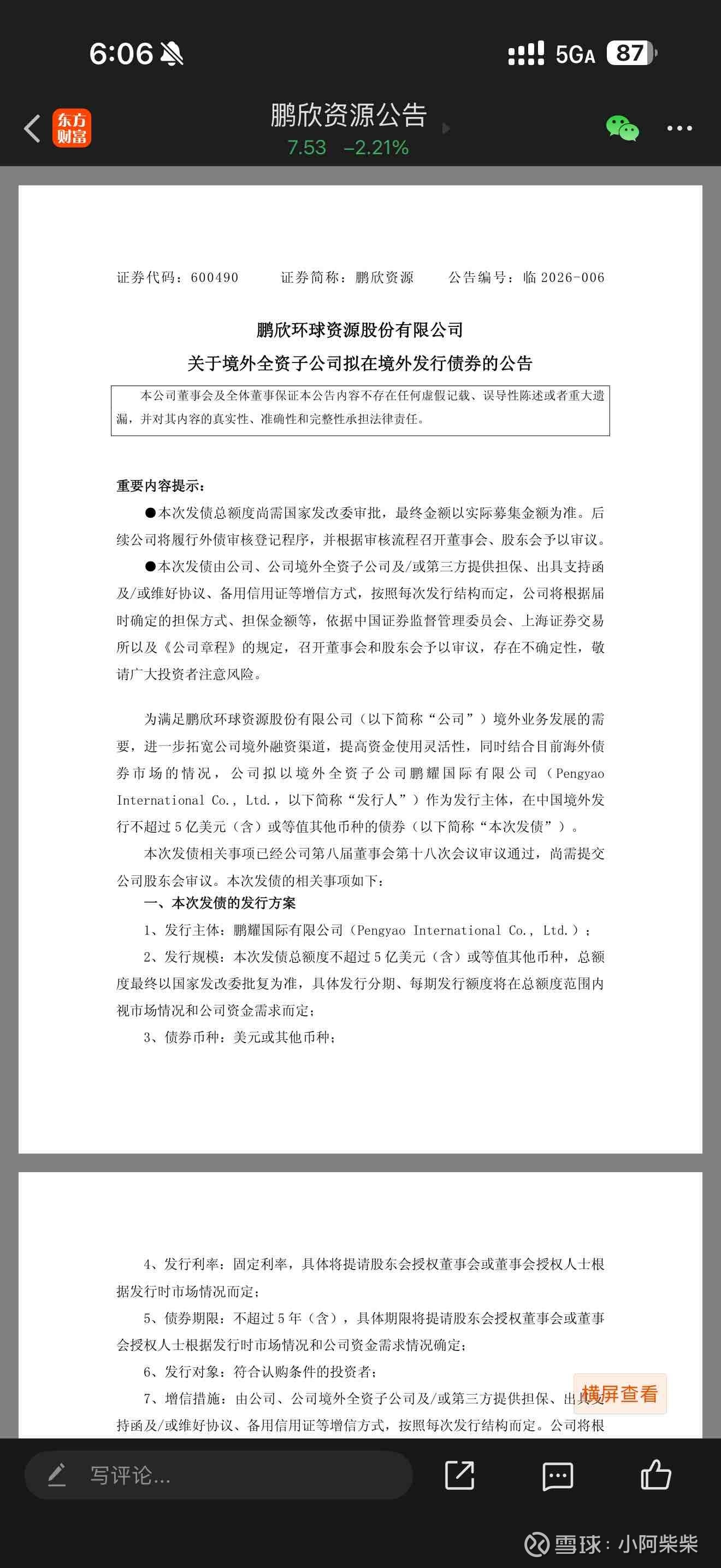$鹏欣资源(SH600490)$ 好消息,境外发行债券不超5亿美元,将极大提速公司后续矿井的开发和复产。结合刚发布的招聘高级地理测绘师的消息,进一步验证了大矿大开战略的推进。公司当前资产负债率太低了,应充分把握时代性机遇,充分资金杠杆化,大矿大开。5亿美金,期待1号井3号井、W矿二期、G矿同步开发。