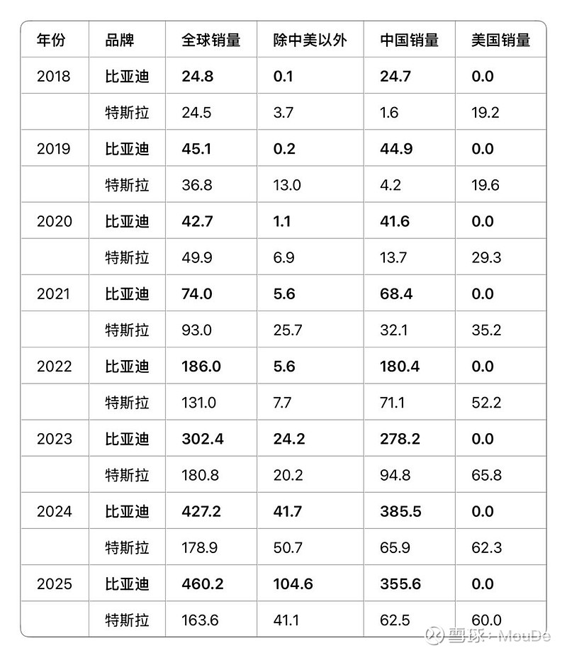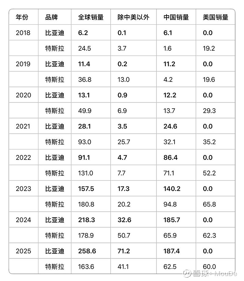 比亚迪和特斯拉的全球销量以及除中美以外销量对比