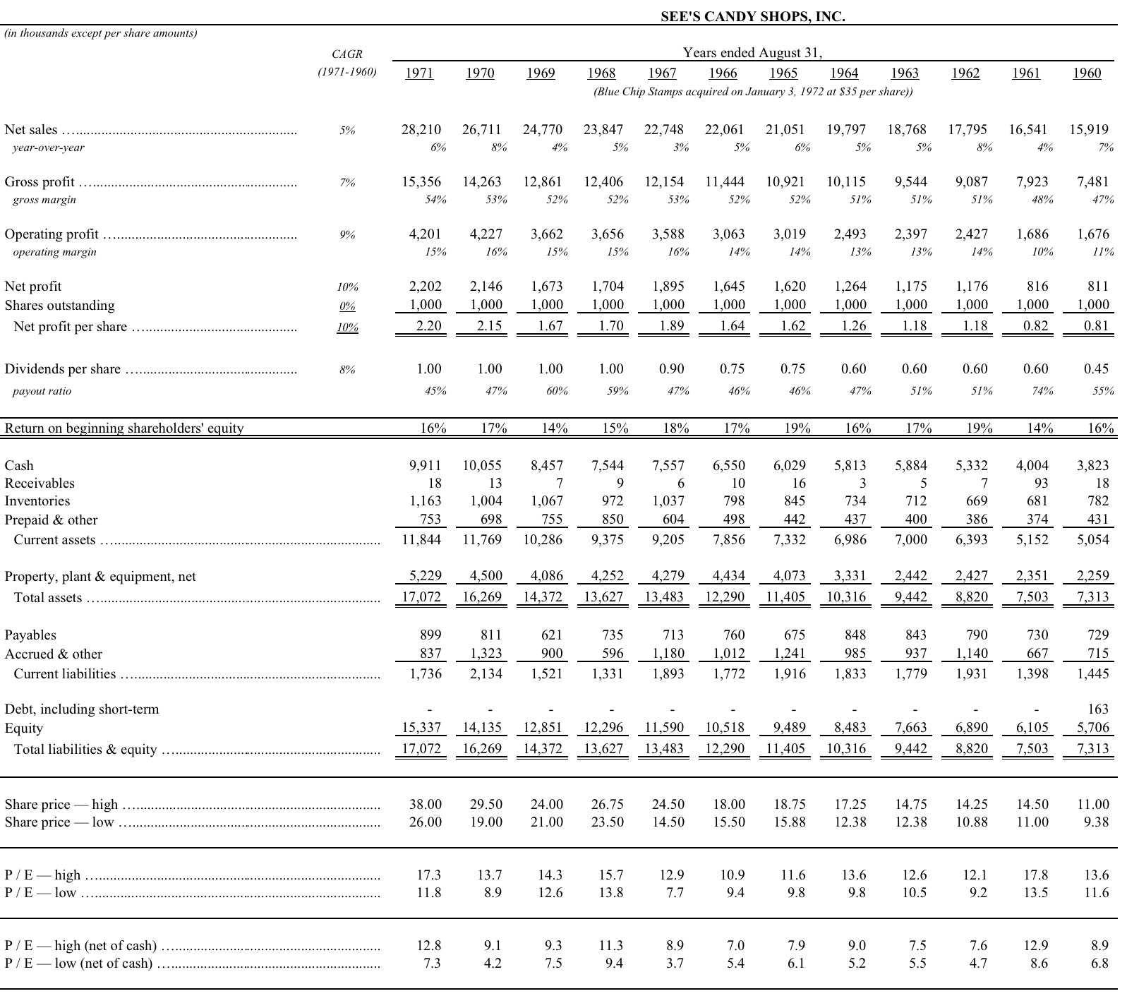 用喜诗糖果为例,2007年EBIT margin=82/383=21.4%,而在1971年这个数字是15%。Op Margin是在不断增长的,在1960年是11%。