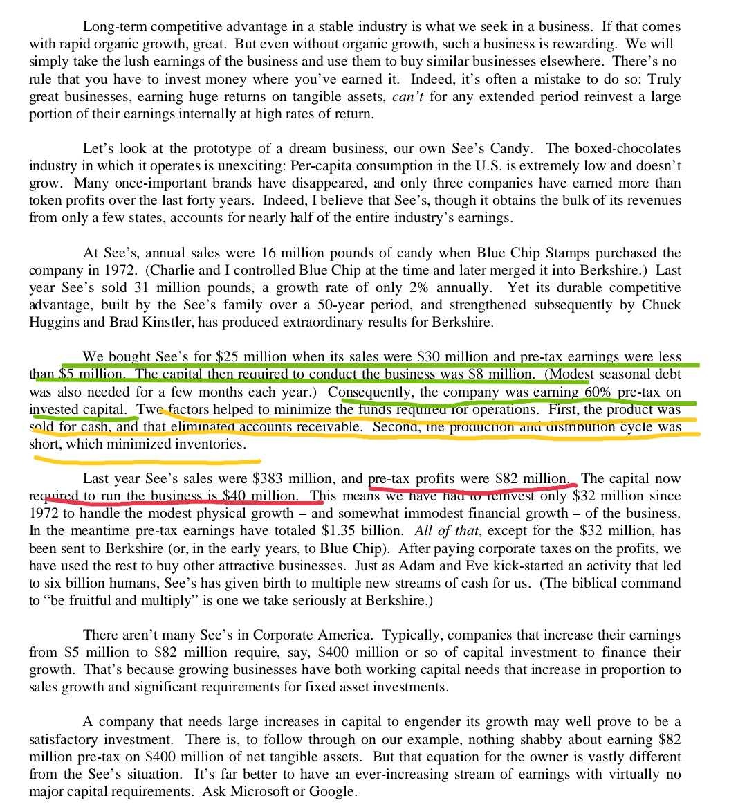 喜诗糖果是巴菲特公司的最完美的典型,几乎每年巴菲特都会念念不忘地用喜诗糖果的例子来教育大众,同时也提醒自己,一个优秀公司的样子。这里也藏着对芒格的感恩:芒格是最先发现ROIC的秘密的,通过喜诗糖果教育了巴菲特。