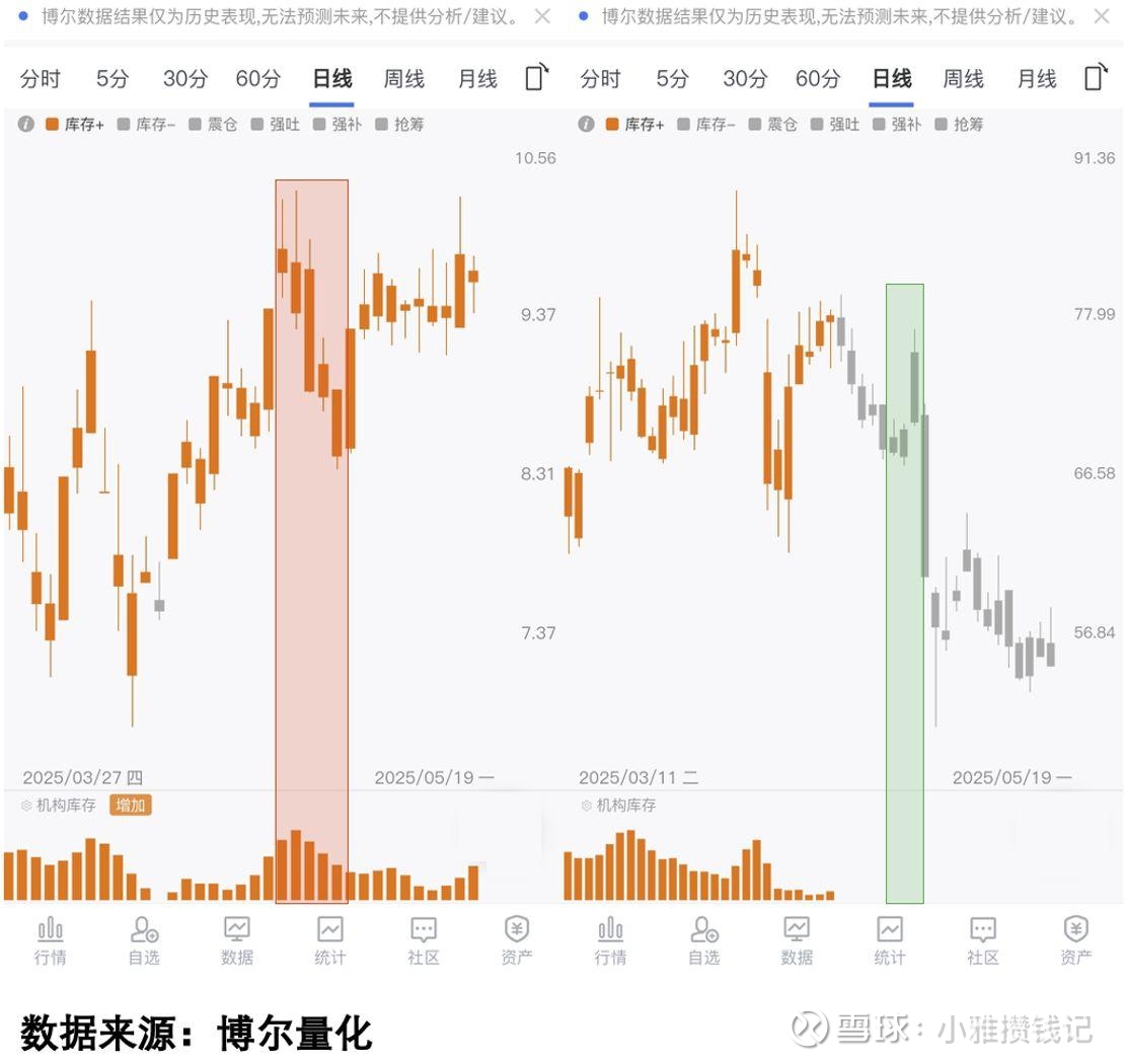 左侧股票虽经历剧烈调整(红框处),但反映机构资金活跃度的橙色柱状始终坚挺。右侧股票却在反弹中途突然"失血",后续虽有反抽却难改颓势。这就是有无机构持续参与的差别——前者调整是机会,后者反弹是陷阱。