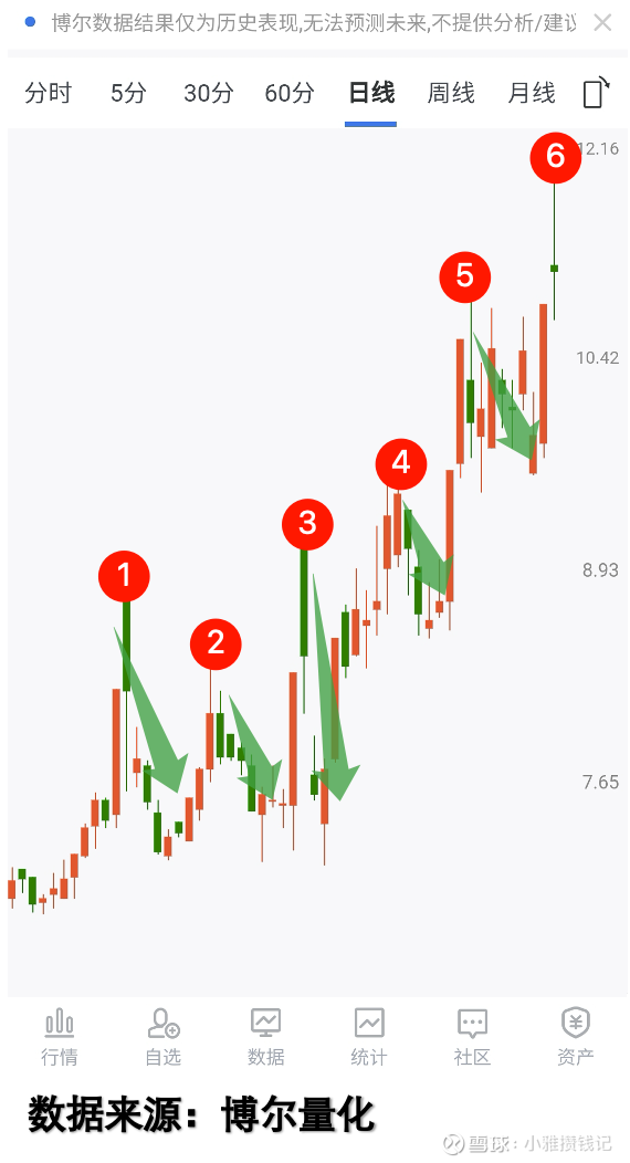 看看这张走势图就明白了。从区域①到区域⑥的五波调整中,前两波简直能把人吓出心脏病。按照传统技术分析,这分明是要"做头"的节奏。但如果你真这么想,就会完美错过后面的大行情。