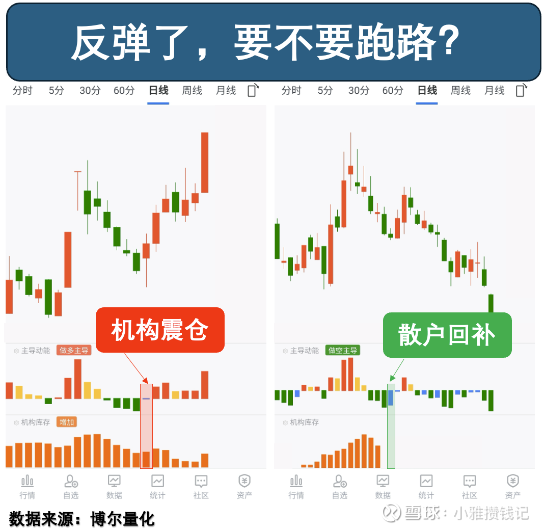 左侧股票呈现蓝色"回补"行为且伴有橙色"机构库存",这是典型的机构震仓;右侧虽然也有回补,但缺乏机构参与,只是散户的自救行为。结果如何?
