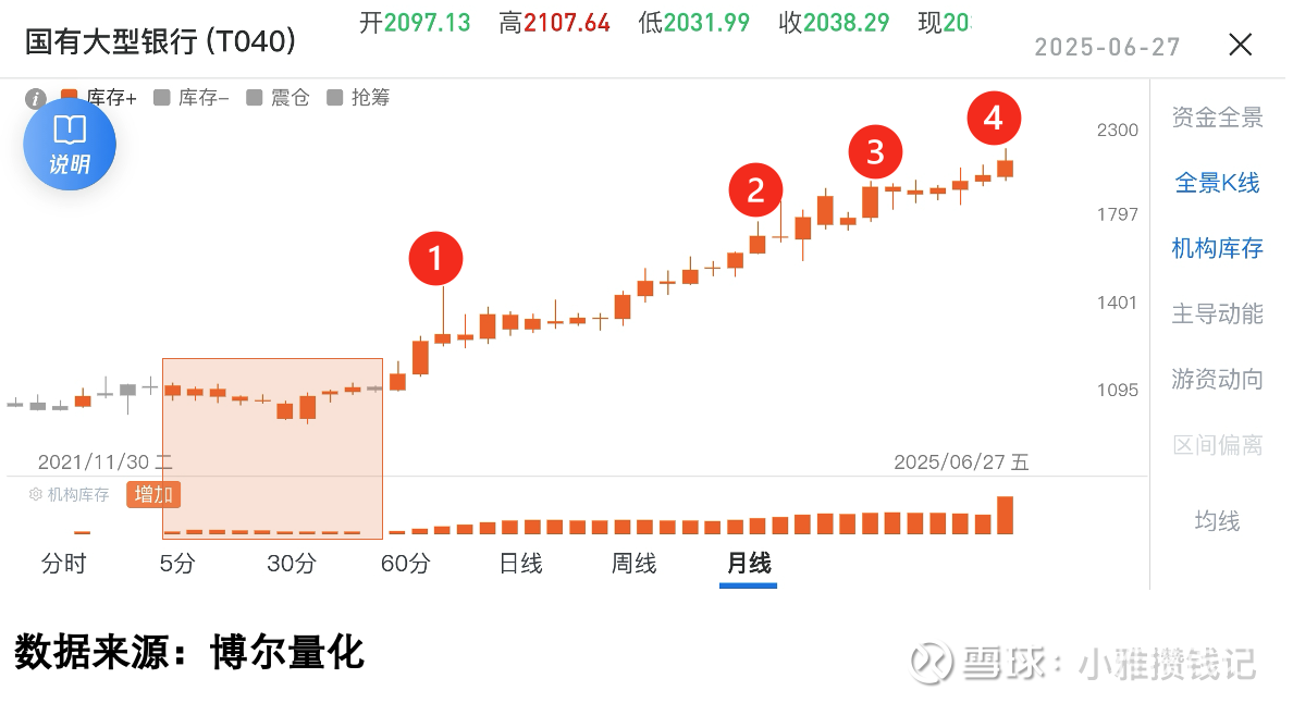 图里下方的橙色柱体叫“机构库存”,反映的是机构大资金的活跃程度——2022年几乎一整年,橙色柱都持续存在,说明机构一直在积极参与交易。你想,要是机构不看好银行,能持续“泡”在里面这么久吗?后来银行一路涨,不是因为“估值合理”,是机构早有布局的结果——哪怕市场有质疑,机构的“动作”比任何“分析”都真实。