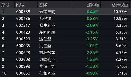 中药ETF(560080)标的指数成分股多数飘绿:众生药业、东阿阿胶跌超2%,云南白药、片仔癀微跌。