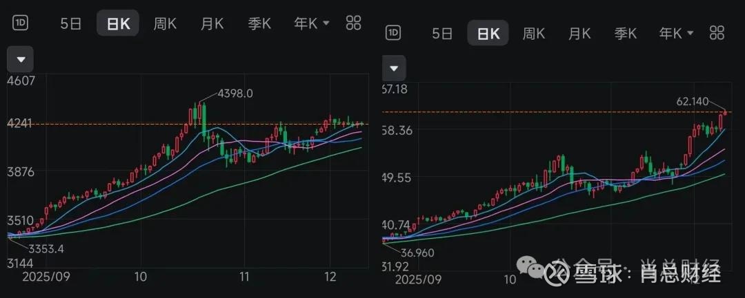 黄金自10月中旬调整后,一直没破前高,整体上还是处于震荡趋势;白银也是10月中旬开始调整,但现在已经破了前高,截止发文已经62了,走出了上升趋势。