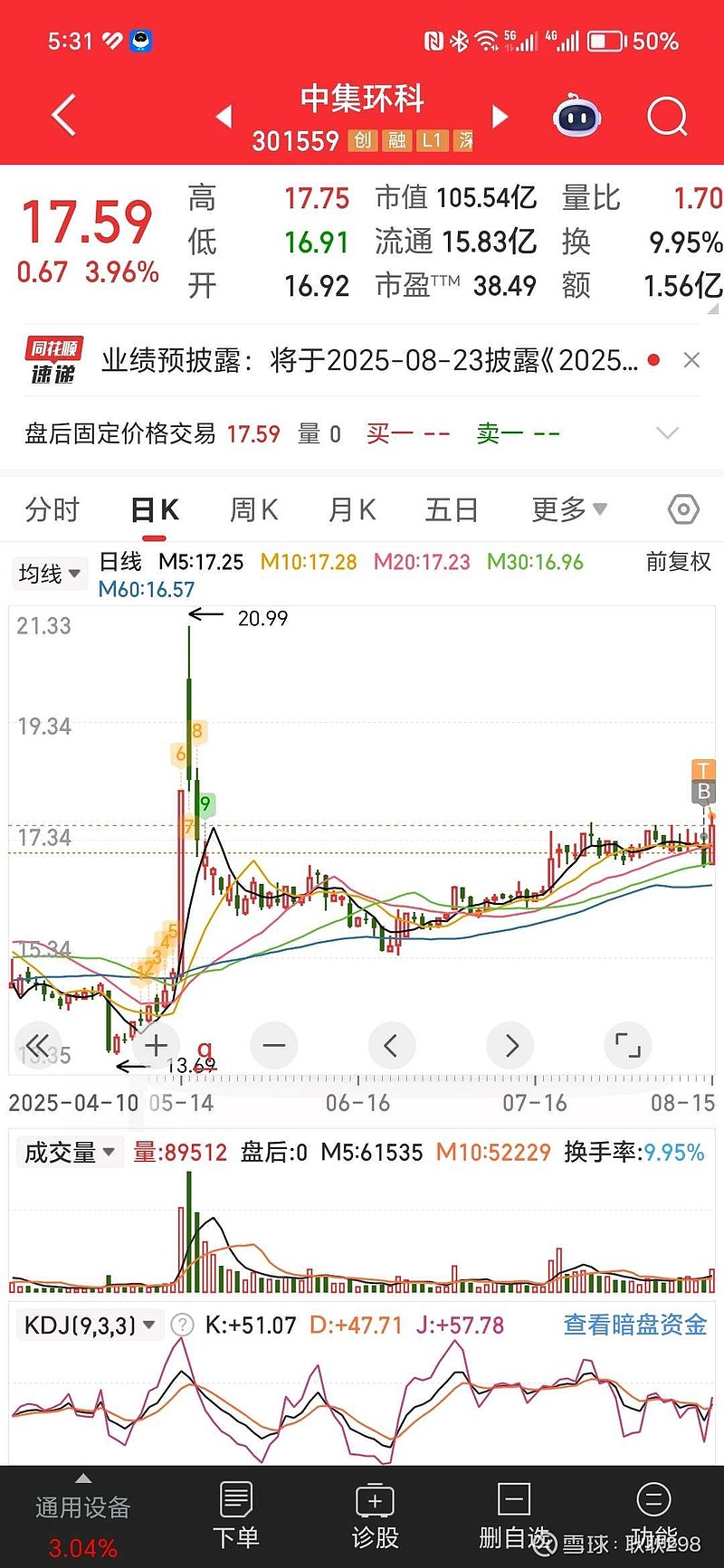 $中集环科(SZ301559)$ 现在要寻找滞涨股,中集环科就是其中一个。从上一次大涨到现在,历时三个月。期间无论大盘如何,该股就是小阴小阳,缓慢爬升。从7月18到现在,经历多次长上影试盘,当各条均线马上走好时,周四突然下杀洗盘,完成起飞前的最后一蹲。今天主力逐分吃货,一旦卖出,就很难有机会低价买回,并且在重要的价位测试了抛盘。下周开始,正式进入主升。所谓箭在弦上,不得不发。
